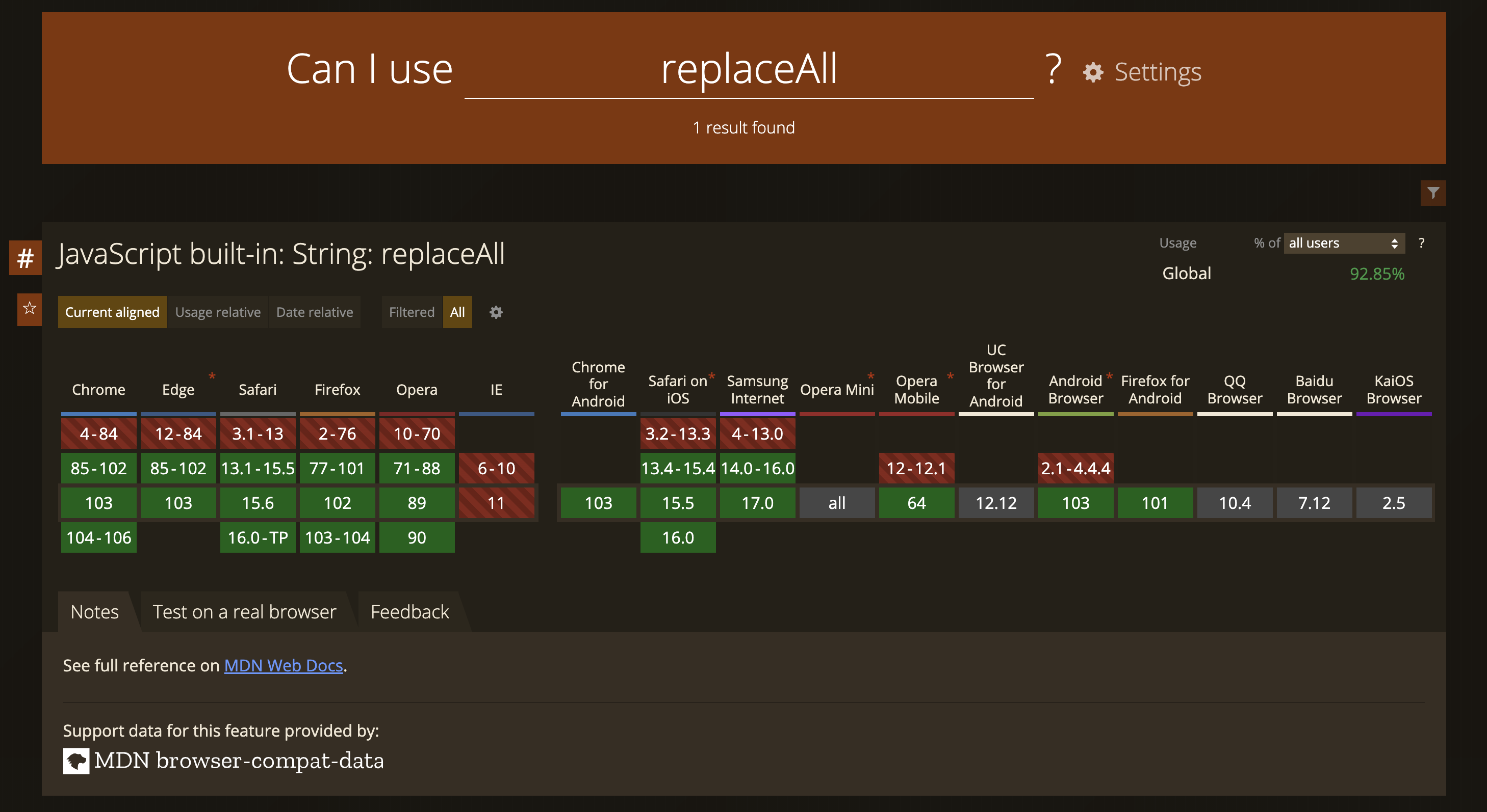 "replaceAll" | Can I use... Support tables for HTML5, CSS3, etc